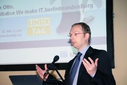 Berlins Wirtschaftssenator Harald Wolf würdigte zur Eröffnung des LinuxTags und der parallel stattfindenden IT-Anwendermesse IT Profits das viel versprechende Konzept aus internationalem Open-Source-Event und regionaler IT-Fachmesse. Der Berliner Politiker erwartet spannende Ergebnisse aus der Kombination der beiden ITK-Plattformen.
