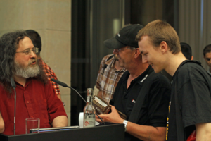 With the 3D-Webcam-Project of the BeLUG association, interested parties can create the 3D-effect themselves with the help of two standard webcams. In this process, one should emphasise, it is possible to understand every single step to the finished image: a highlight for experimenters. With the Video Disk Recorder based on the same software (VDR), there is the possibility to use a computer as a digital video recorder. The software can be extended with custom plug-ins. At the LinuxTag 2012, the BeLUG is going to provide, together with Till Kampeter of Open Printing, a print service, which can be used by the visitors. There is the option to print using the web interface BeLUG or to set up the printer on the local system. (Picture: BeLUG members in discussion with Richard Stallman after a lecture about eBooks in June 2011 in Berlin.)